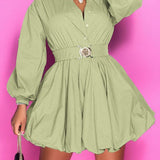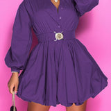 Button-Front Belted Puffy Dress