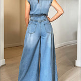 • Spread Collar, Sleeveless, Button Front, Wide Leg