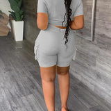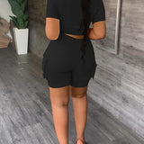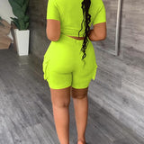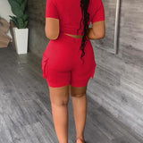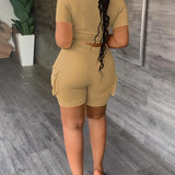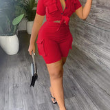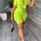 - Spread Collar, Short Sleeves, Button Front, Chest Pockets, Tied Front