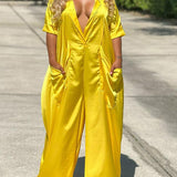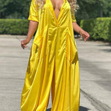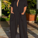 • Spread Collar, Deep V Neck, Short Sleeves, Wide Leg, Two Pockets