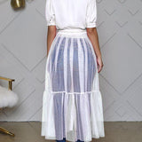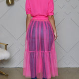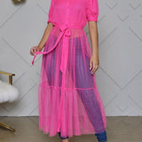 - Short Sleeve, Button Front, Sheer Combo, Ruffle Hem