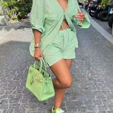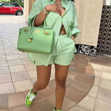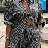 - Spread Collar, Long Sleeves, Button Front, Drawstring Elastic Waist