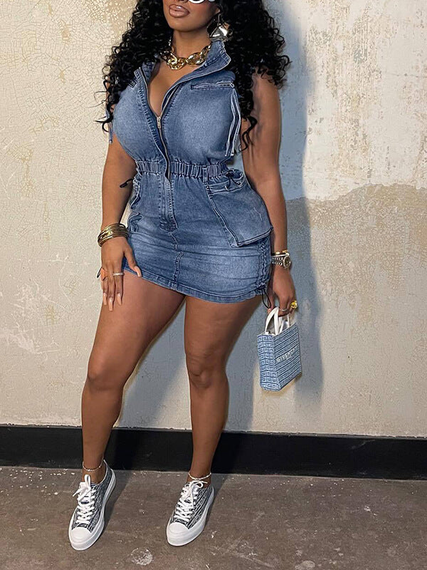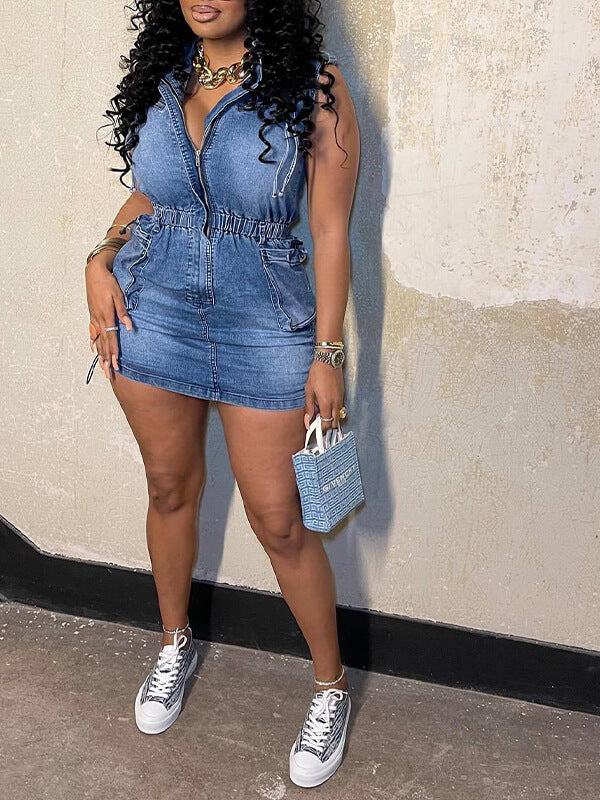 Zip-Front Sleeveless Denim Dress
